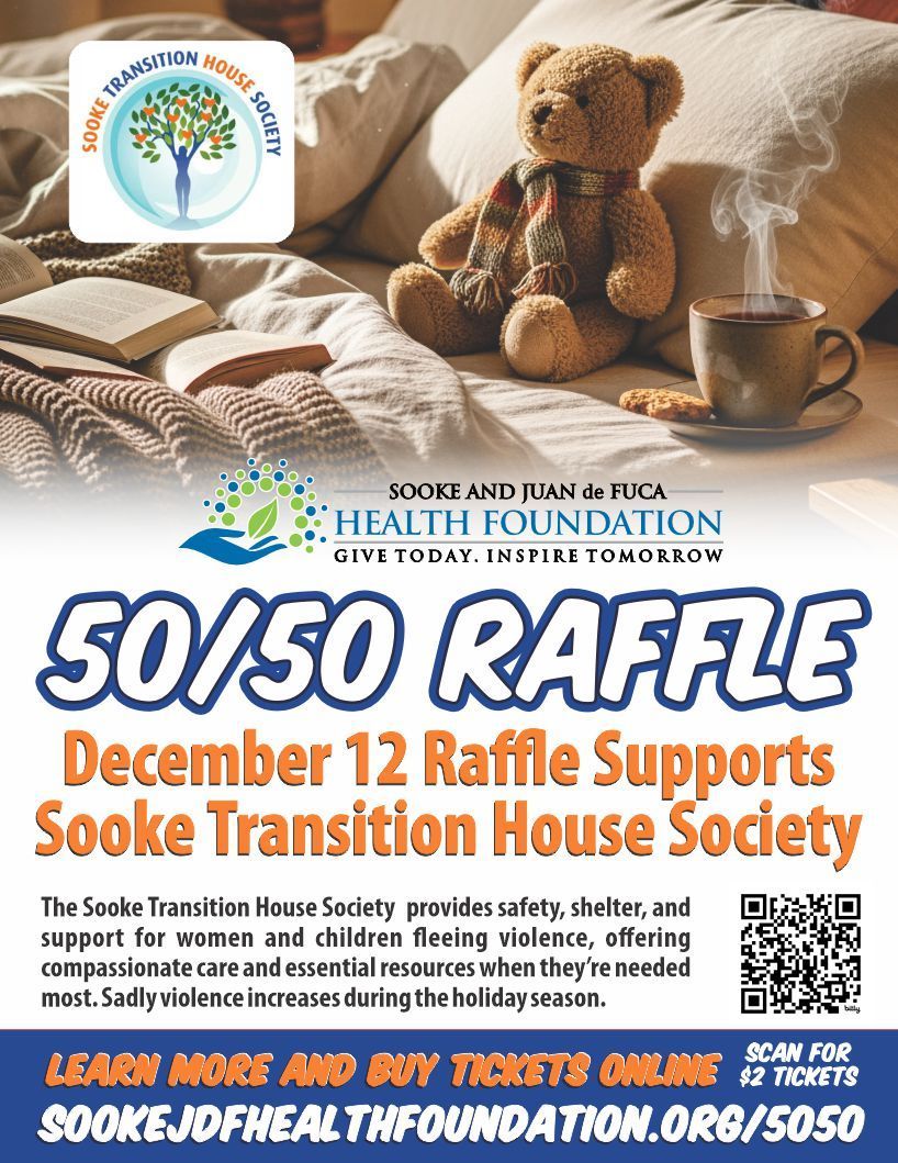 The Sooke Health Foundation is proud to announce the Sooke Transition House Society as the next recipient of our 50/50 fundraising draw. This vital local organization provides safety, shelter, and support for women and children fleeing violence, offering compassionate care and essential resources when they’re needed most. Funds raised will help enhance safety and security for those escaping violence—needs that increase during the holiday season. Thank you for helping build a safer, healthier Sooke.